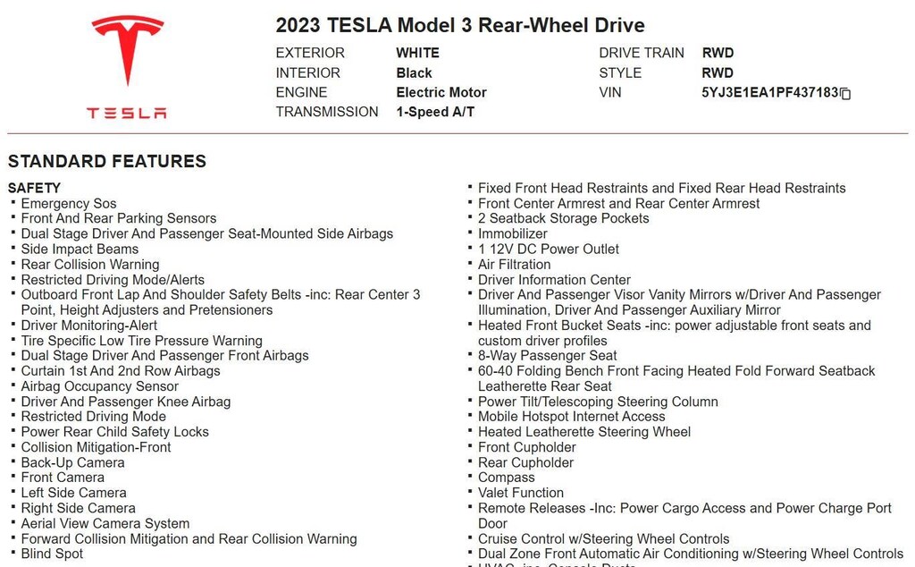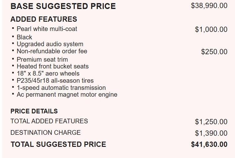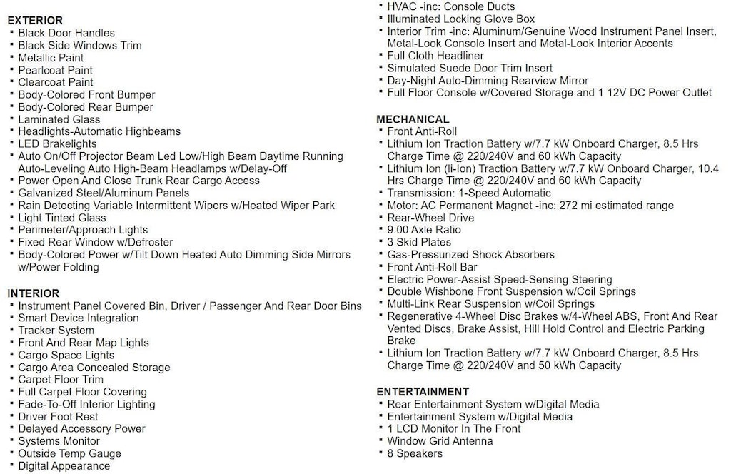 Rear-Wheel Drive, Lithium Ion (li-Ion) Traction Battery w/7.7 kW Onboard Charger, 10.4 Hrs Charge Time @ 220/240V and 60 kWh Capacity, 8 Speakers, Heated Leatherette Steering Wheel, Blind Spot, Back-Up Camera, Front Camera, Left Side Camera, Right Side Camera