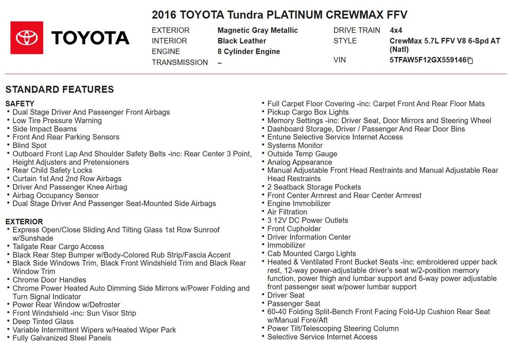 Backed by Toyota's renowned reputation for quality, reliability, and durability, this 2016 Tundra Platinum is a true standout in the full-size truck segment. With its impressive list of features, powerful performance, and exceptional value, this Tundra is the ultimate choice for discerning truck enthusiasts.