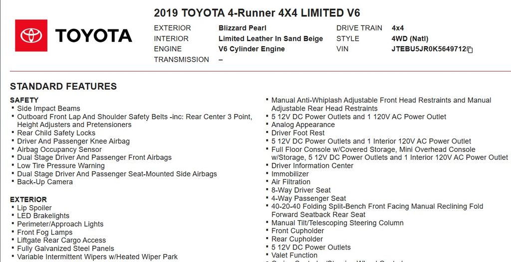 Discover the ultimate adventure-ready SUV with this stunning 2019 Toyota 4Runner Limited 4WD. Boasting an impressive array of premium features, this vehicle is primed to elevate your driving experience.