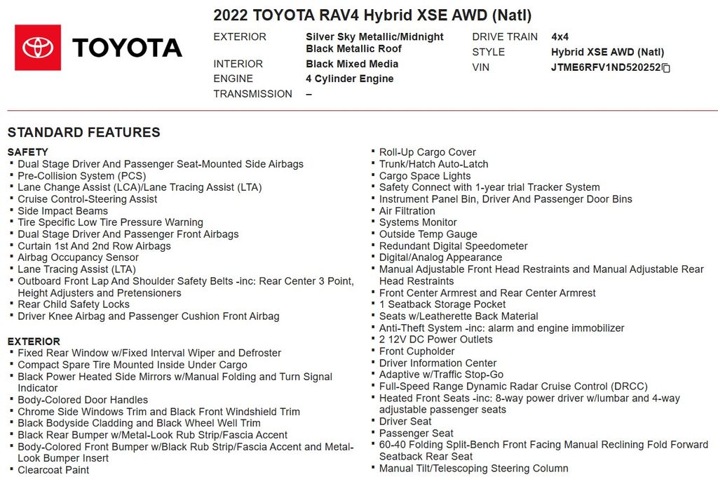 We invite you to experience the exceptional value and quality of this 2022 Toyota RAV4 Hybrid XSE AWD. We offer free Carfax vehicle history reports on our website, and our team is ready to assist you with any questions or to schedule a test drive. Can I hold or reserve this vehicle? Yes, you can reserve this vehicle with a deposit of $1,000. Please contact Sales Team for details at 972-243-3400. Can I get financing on this vehicle? Yes, we offer a variety of financing options for qualified buyers and work with banks and credit unions. Are there any Dealer Add-Ons or excessive fees? Texas Cars Direct does NOT have add-ons. The price you see is the price you pay! (excluding applicable tax, title, license) Can I trade my vehicle in? Yes, Texas Cars Direct accepts trade-ins and offers fair market values based on condition, mileage, and demand. Can I purchase online? Yes, many customers complete the entire process online, including financing, paperwork, and delivery arrangements. Can this vehicle be delivered? Yes, nationwide.