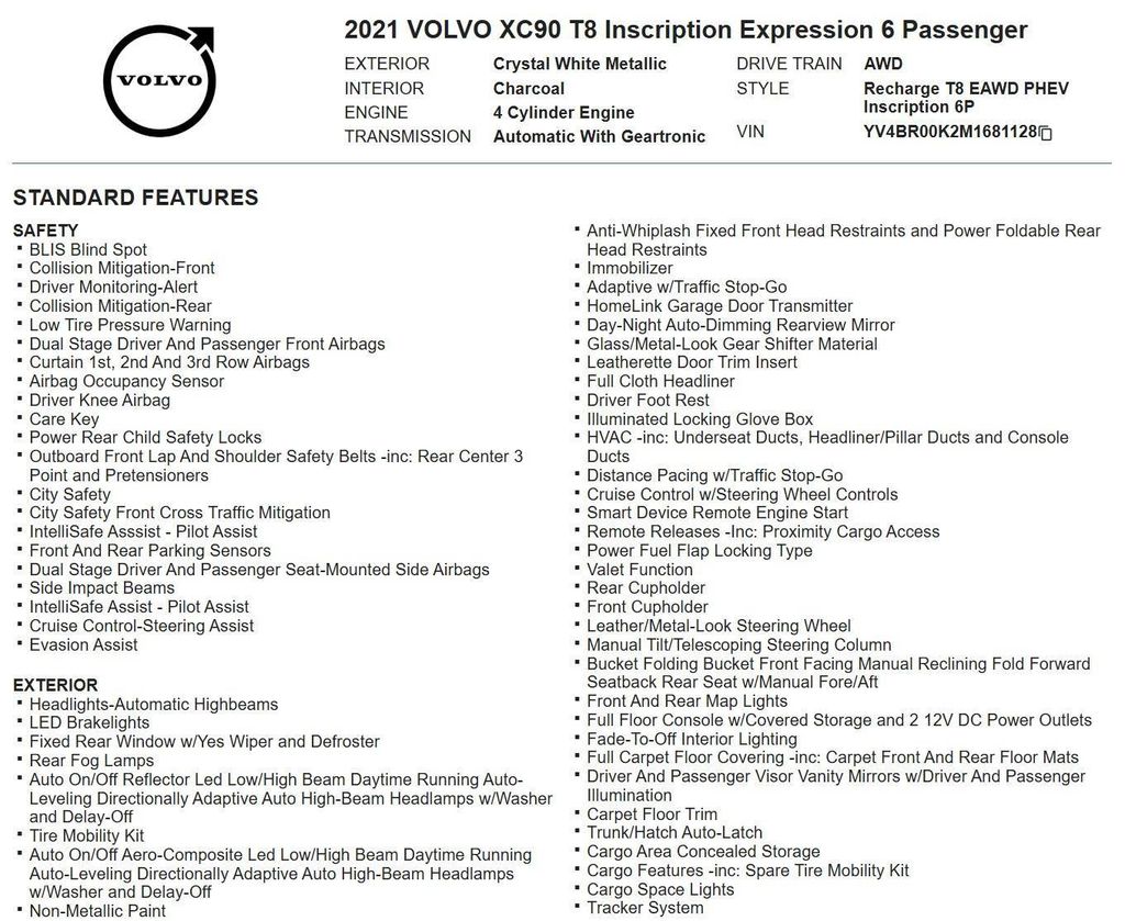 This 2021 Volvo XC90 Inscription Expression, has Crystal White Metallic exterior and Charcoal interior color. 61,296 miles. Stock Number 681128. You can connect with us by calling 972-243-3400.