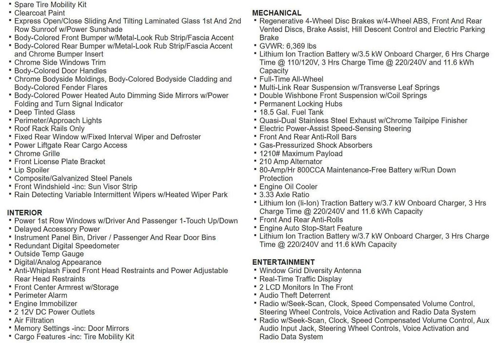 Regenerative 4-Wheel Disc Brakes w/4-Wheel ABS, Front And Rear Vented Discs, Brake Assist, Hill Descent Control and Electric Parking Brake, Lithium Ion (li-Ion) Traction Battery w/3.7 kW Onboard Charger, 3 Hrs Charge Time @ 220/240V and 11.6 kWh Capacity, HomeLink Garage Door Transmitter, Adaptive w/Traffic Stop-Go, Front And Rear Parking Sensors, BLIS Blind Spot