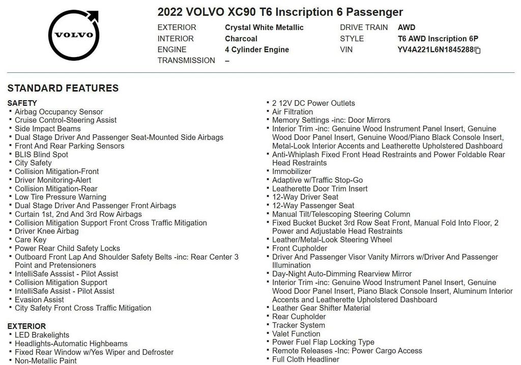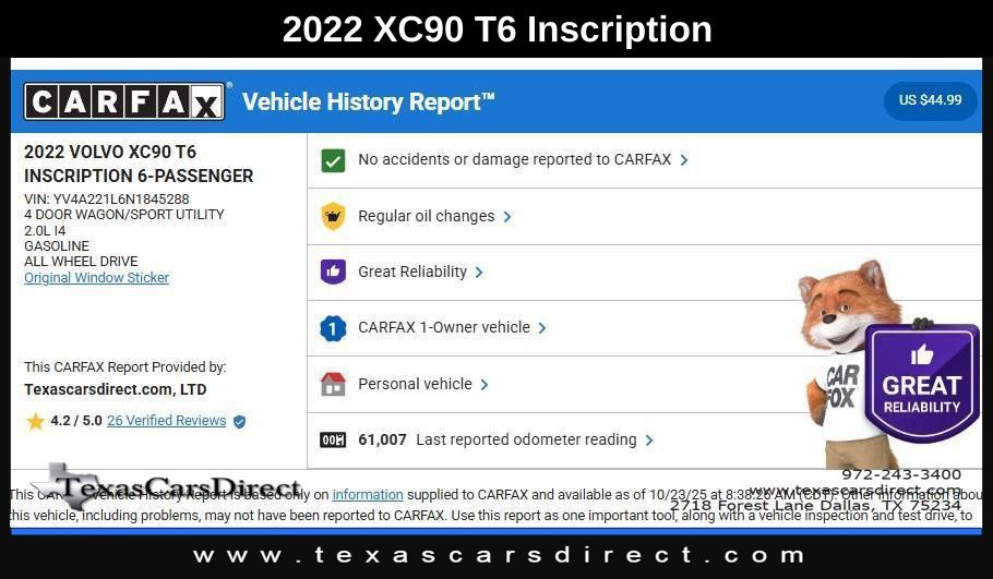 This 2022 Volvo XC90 Inscription, has Crystal White Metallic exterior and Charcoal interior color. 63,164 miles. Stock Number 845288. You can connect with us by calling 972-243-3400.