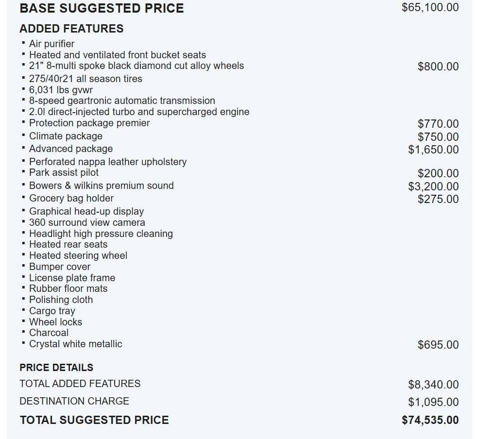 ENGINE: 2.0L DIRECT-INJECTED TURBO & SUPERCHARGED, WHEELS: 21" 8-MULTI SPOKE BLACK DIAMOND CUT ALLOY, CHARCOAL, PERFORATED NAPPA LEATHER UPHOLSTERY, CLIMATE PACKAGE, ADVANCED PACKAGE, BOWERS & WILKINS PREMIUM SOUND, PROTECTION PACKAGE PREMIER